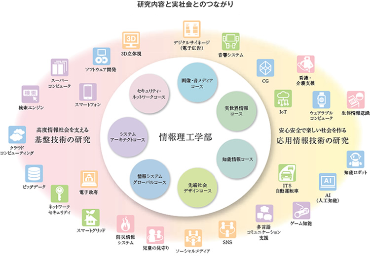 各専門領域を深く学ぶ日本語基準の6つのコースに加え、さまざまな分野の知識を横断的に活用してグローバルな環境で問題解決を実践する英語基準のコースを設置しています。情報分野を取り巻く新たな社会状況に対応できる人材の育成を目指します。