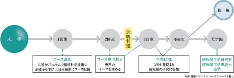 | 特長1 | 1回生では情報科学分野全般の基礎を学修し、春学期終了時に各自の興味や将来のビジョンを考慮してコースを選択します。 |