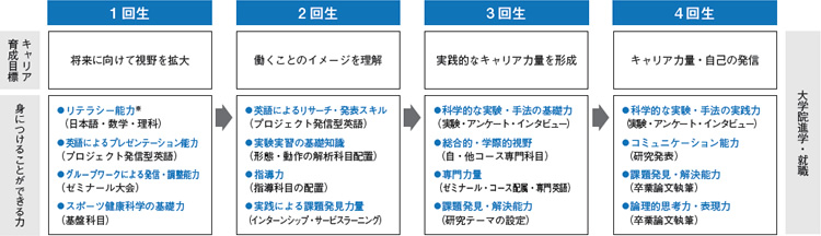 系統的なカリキュラムで低回生時には基礎的学力を鍛えるだけでなく、1回生秋学期より専門的な科目を学び始め、高回生時には多様な関心や目指す進路に応じて学びを深めます。4つの領域(スポーツサイエンス領域・健康運動科学領域・スポーツ教育学領域・スポーツマネジメント領域)からなる専門科目を、所属に縛られることなく横断的に学び、その学際的な学びを応用し「分野を超えた挑戦」を実践します。