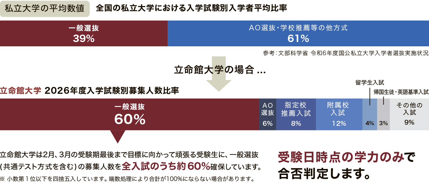 HOME > 入試案内 > 一般選抜 > 一般選抜のポイント 入試案内 一般選抜 一般選抜のポイント 立命館大学の一般選抜は、最後まで目標に向かって努力する受験生を求めます。 一般選抜入試説明 2026年度の各入試方式について、概要や特徴、併願のポイントを説明しています。 一般選抜の募集人数比率が私大最大級の規模 気になるトピックから2026年度一般選抜入試の重要ポイントを押さえよう! 入試方式ごとの詳細な情報は以下をCHECK! 一般選抜 全入試方式の詳細 入試方式毎の入試日程 全入試方式の合格最低点 併願制度と入学検定料 入試要項のダウンロード、資料請求はこちら 入試案内 『入試要項』ダウンロード 『入試ガイド』ダウンロード 入試概要 一般選抜 一般選抜のポイント 「情報」の本学独自入試の導入について 入試日程・出願期間・合格発表 入試方式 併願・入学検定料について 学部別概要 受験上の配慮について 災害等に伴う入学検定料の特別措置 入試Q&A 2025年度一般選抜の解答例 総合型選抜(AO・文芸・スポーツ選抜) 帰国生・留学生・英語基準入学試験 その他の入学試験 入学試験結果 過去問題・講評 入試Q&A 入学手続