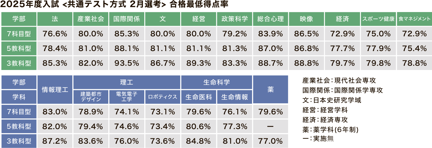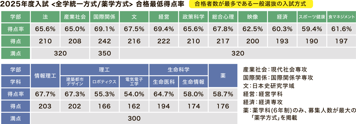 メイン入試「全学統一方式」の合格最低点(2025年度入試)