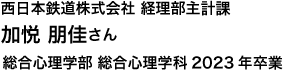 2019年、総合心理学部入学。卒業論文のテーマは「離婚に対する社会的まなざしを両親の離婚を経験した青年はどうとらえるか」。2023年、総合心理学部卒業、西日本鉄道株式会社に入社。将来は、MaaS アプリの普及によるシームレス移動の実現や、駅前や高架下の用地を活用した商業施設の運営事業などに携わることを目指している。
