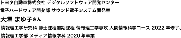2016年、情報理工学部に入学。2020年、情報理工学研究科に進学。2022年に博士課程前期課程を修了し、トヨタ自動車株式会社に入社、デジタルソフトウェア開発センター 電子ハードウェア開発部に配属。2023年4月、博士号の取得を目指し,大学院博士課程後期課程に社会人博士枠で進学。